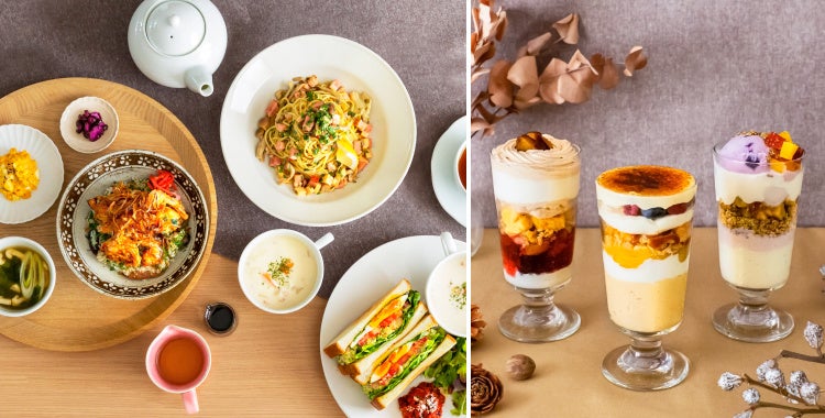 秋の季節限定メニューは、旬の食材を使った彩り豊かな新メニューが登場。お食事メニューには、豊かな香りと食感が魅力のきのこをたっぷり楽しめるメニューをご用意しました。デザートは、栗やさつまいも、りんごなどを使った、秋を感じるスイーツが登場します。
