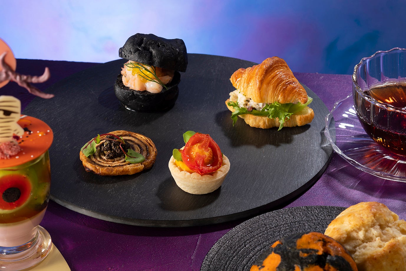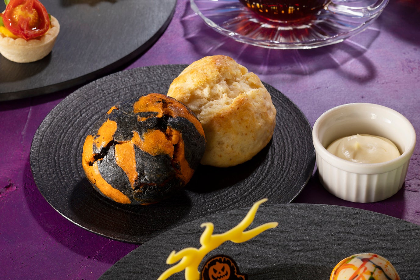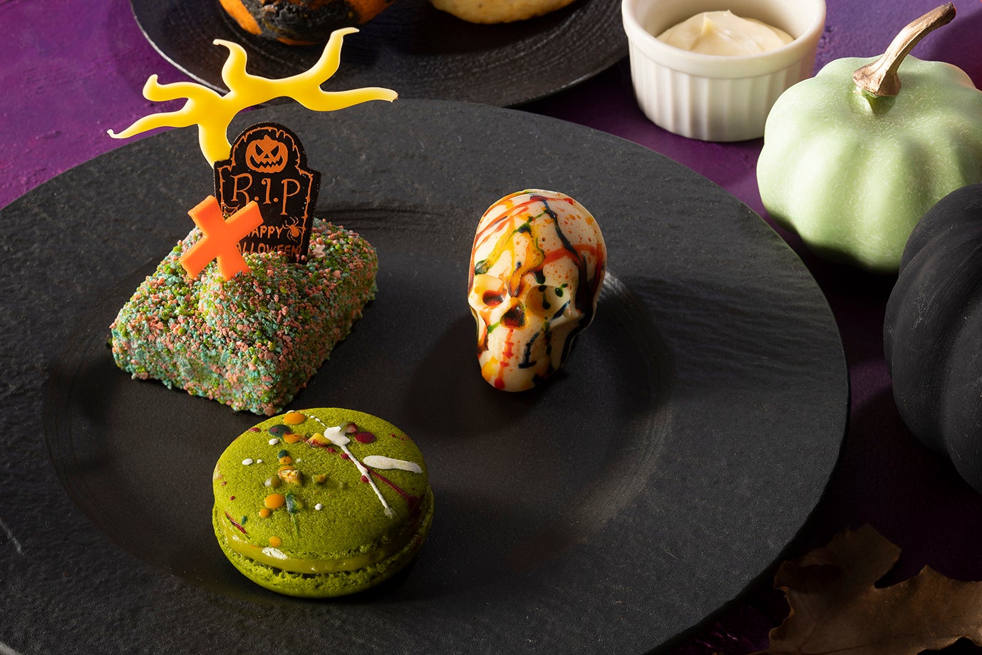 今年のハロウィンは”ホーンテッドアート”と題し、秋の味覚が一度に楽しめるスイーツやセイヴォリーをアートで表現し、目にも楽しいアフタヌーンティーをご用意いたしました。目玉マシュマロを忍ばせたフルーティーなグラスデザート「ラズベリーパンナコッタとマチュドニアゼリー」や、フランケンシュタイン風の「チョコレートとスイートポテトチーズケーキ」などかわいいお化けたちが登場。セイヴォリーにはクランベリーの甘みとアーモンドの食感が楽しい「ローストチキン クランベリー ミニクロワッサン」や旬のかぼちゃをヘルシーに仕上げた「かぼちゃと豆腐のタルトレット」、そして焼き菓子にはジャックオランタンをイメージした「ココアとパンプキンのマーブルスコーン」など遊び心を加えた品々を揃えました。