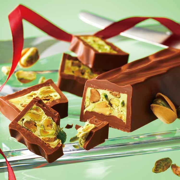 深煎りしたピスタチオと塩がけしたピスタチオの2種類を、香ばしくコク豊かなピスタチオクリームにぎっしり詰め、まろやかなミルクチョコレートで包みました。噛むほどに広がるピスタチオの旨みと、程よい塩味がアクセント。切り分けると、なめらかなピスタチオクリームとたっぷり入ったピスタチオが表情豊かに顔をのぞかせます。お好きな厚さに切り分けて食べるスタイルが楽しいチョコレートです。