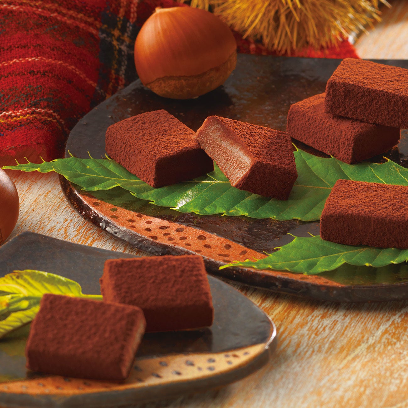 ミルクチョコレートにマロンパウダーをブレンドし、やさしい栗の味わいをダイレクトに感じられる生チョコレートにしました。まろやかなコクのある栗独特の味わいが、ミルクチョコレートとの出会いでより洗練されたおいしさに。隠し味は、甘く香るラム酒とブランデー。2種類のお酒が栗の風味を引き立て、豊かな余韻が広がります。