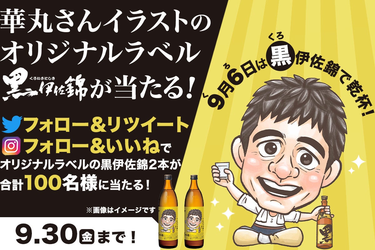 〈黒伊佐錦〉でお馴染みの大口酒造から、TVCM『ねぇ、くろいさん。』シリーズに出演している博多華丸さんのイラストが入った限定ラベルの〈黒伊佐錦〉900ml 2本を合計で100名様にプレゼントいたします。