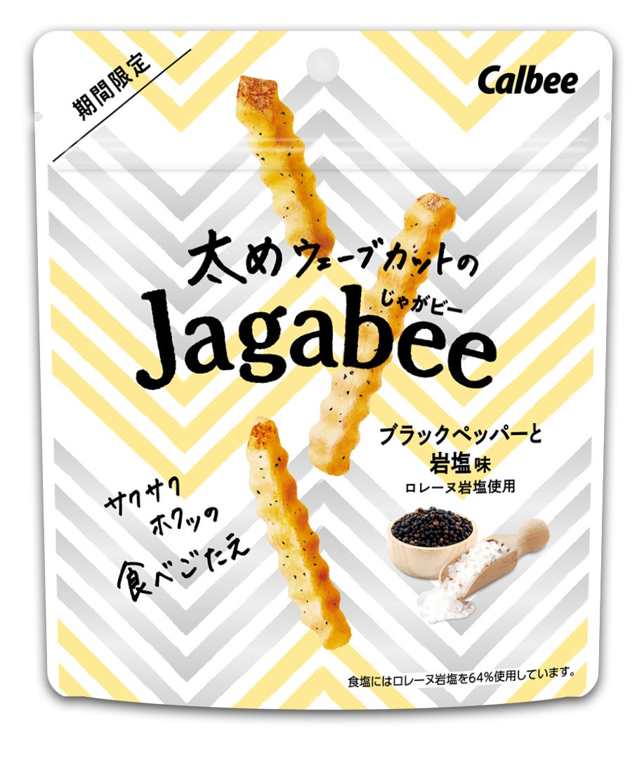 「Jagabee」は、じゃがいもの味わいにこだわった独自のサクッホクッとした食感が心地よい、“じゃがいもの味がちゃんとする”スナックです。2006年の発売以降、「うすしお味」や「バターしょうゆ味」といった定番品の他、品種やカットのバリエーション展開でじゃがいもの新たなおいしさをご提案してきました。2020年にスティックの4面すべてをウェーブ状にし、定番品よりも太めにカットした「ホクホクのフレンチフライのようなJagabee ブラックペッパー味」を発売したところ、お客様から「これまでにない新食感で凄く美味しい」「色々な味で展開して欲しい」といったお声をいただきました。そこで2021年には「太めウェーブカットのJagabee サワークリームオニオン味」を発売し、大変ご好評をいただきました。今回は、ウェーブカットの食感を引き立てる素材にこだわり、ロレーヌ岩塩※1を使用した『太めウェーブカットのJagabee ブラックペッパーと岩塩味』を新発売いたします。ブラックペッパーの爽やかでスパイシーな刺激とロレーヌ岩塩のまろやかな塩味で後引くおいしさに仕上げています。