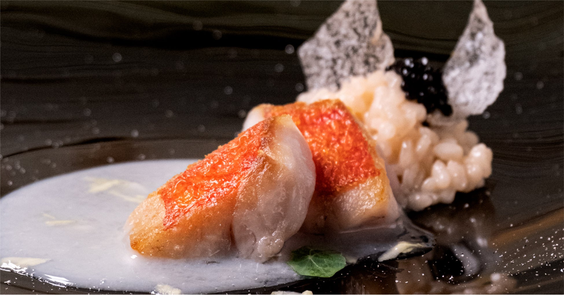 〜鮮魚のクロッカンテ 甘酒のサルサと謙太郎米のリゾット キャビアとワサビを添えて〜