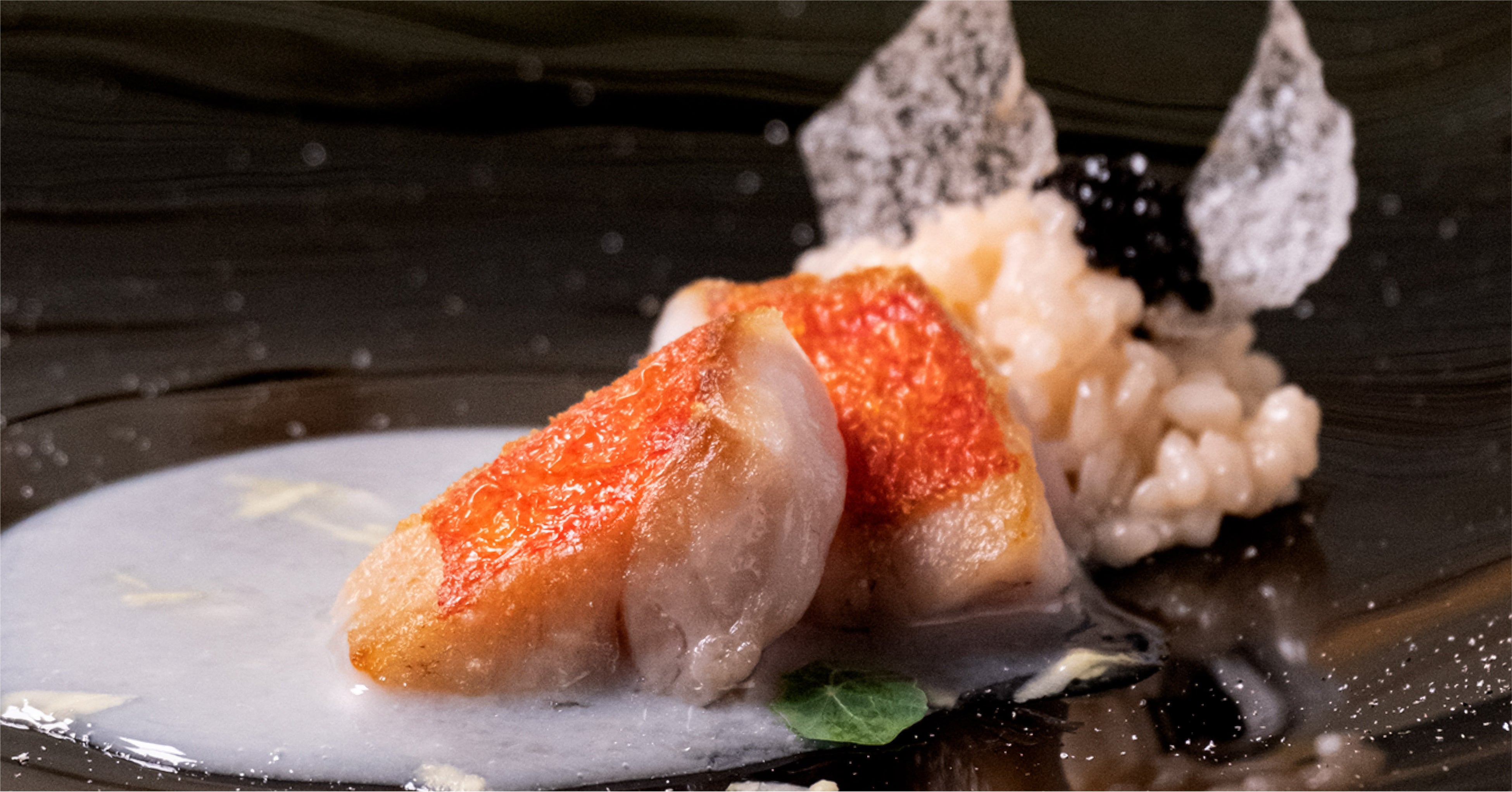 〜鮮魚のクロッカンテ 甘酒のサルサと謙太郎米のリゾット キャビアとワサビを添えて〜