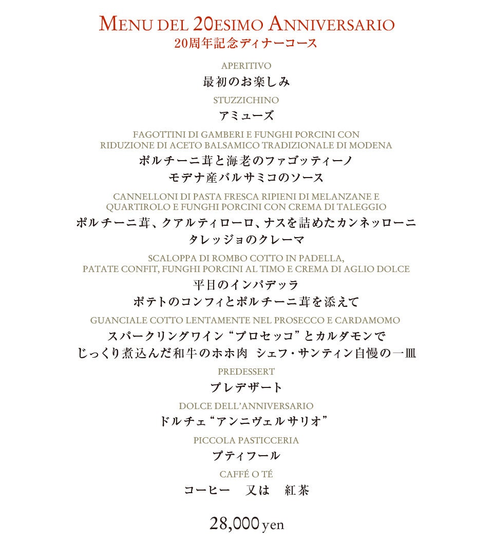 9月7日(水)からは、装いも新たに、前菜や魚料理に秋の味覚ポルチーニをあしらった薫り高く優雅な20周年記念ディナーコースをご用意いたします。冬にはイタリア直輸入の白トリュフを使った期間限定メニューを予定しており、季節ごとのバラエティに富む珠玉のメニューを一年通じてお楽しみいただくことができます。