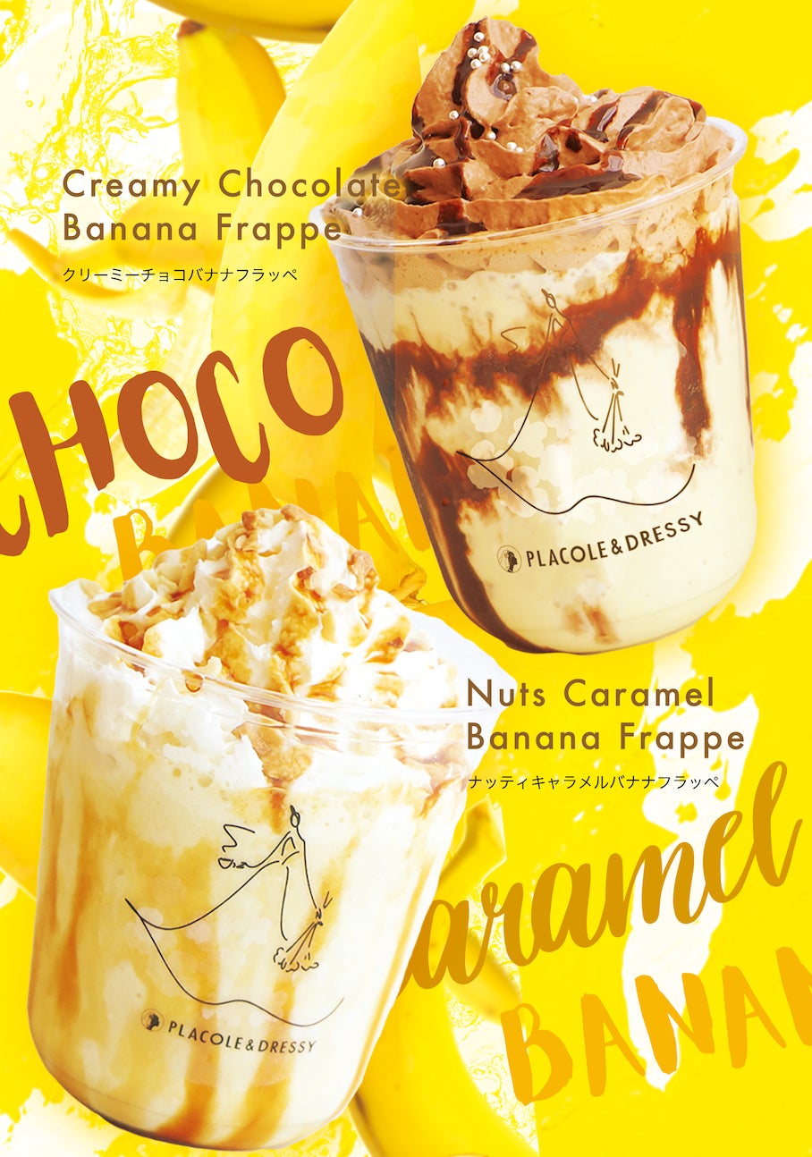 バナナを丸ごと1本つかったフラッペ。チョコレートとキャラメルの2種をご用意。クリームまでチョコレート、トッピングで食感も楽しめるチョコとバナナの王道の組み合わせと、たっぷりキャラメルソースで甘めのナッツがアクセントになりクリーミーでミルク感もある2種のフラッペとなっております。