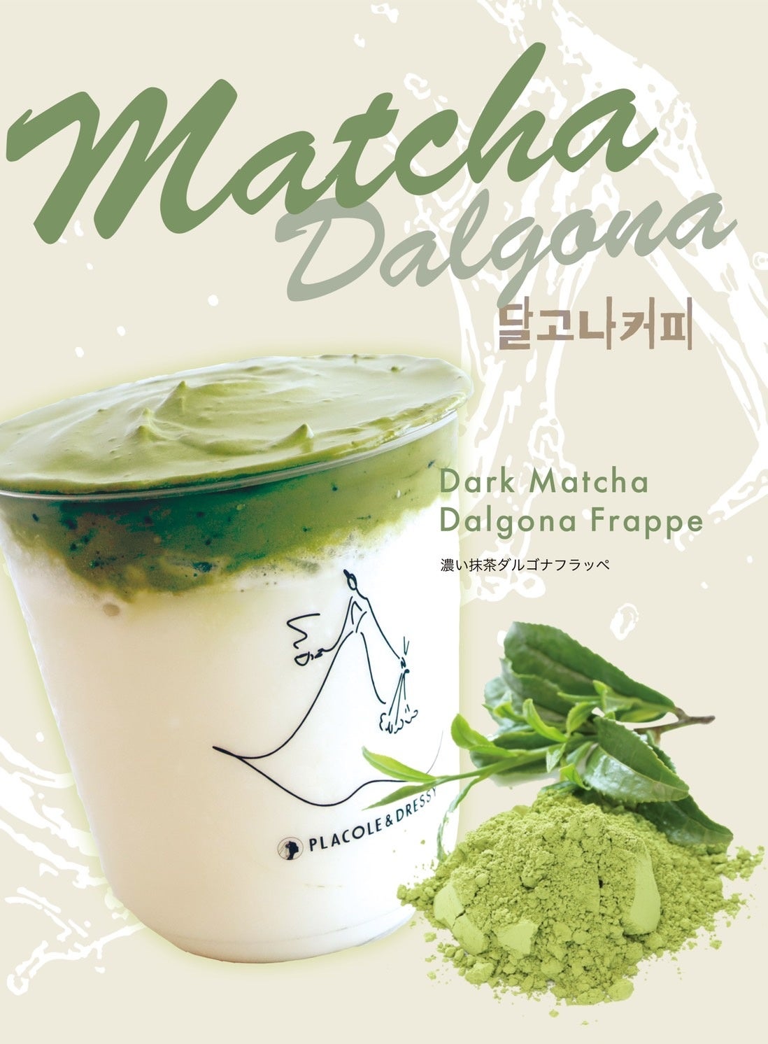 韓国でも大人気の抹茶味。濃厚抹茶と甘いミルク氷のダルゴナ抹茶。混ぜるとまろやかな抹茶フラッペとなっています。