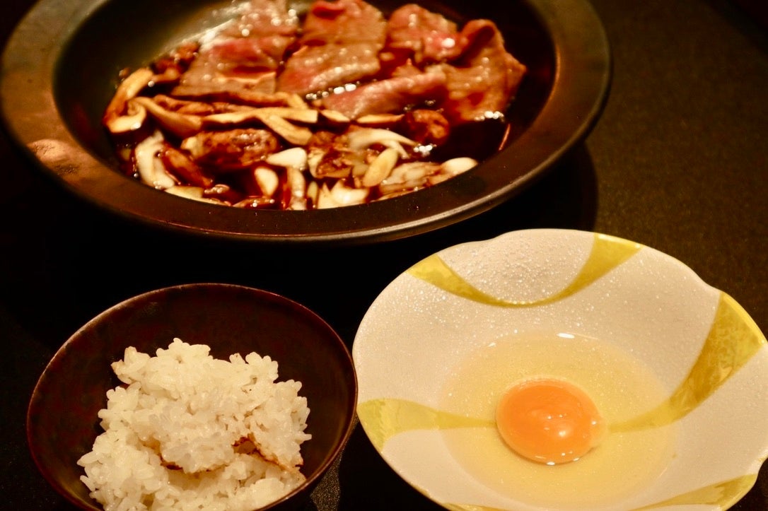 - ご飯片手にすき焼き風に仕上げた松茸×和牛を頬張る
