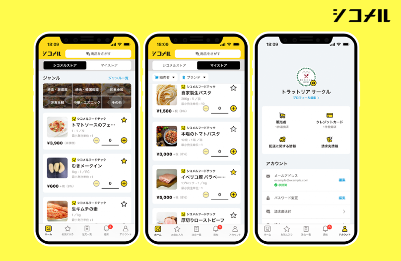 飲食店の仕込みにまつわる課題解決を目指すアプリとして2020年10月にリリース。アプリダウンロード数は1万6000を突破、登録店舗数も2700店以上に拡大しています。飲食店やフード提供事業者から預かったレシピを元に、味や見た目を忠実に再現した仕込み済み商品を、シコメルと提携している食品工場にて製造。飲食店や施設は出来上がった仕込み商品をアプリから発注することができます。また「シコメルストア」では、全17ジャンルから有名シェフやレストランの仕込み済み商品などを発注でき、自店舗のメニュー拡充に活用することができます。