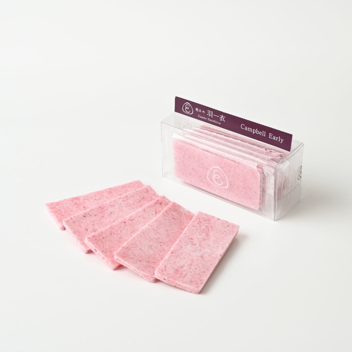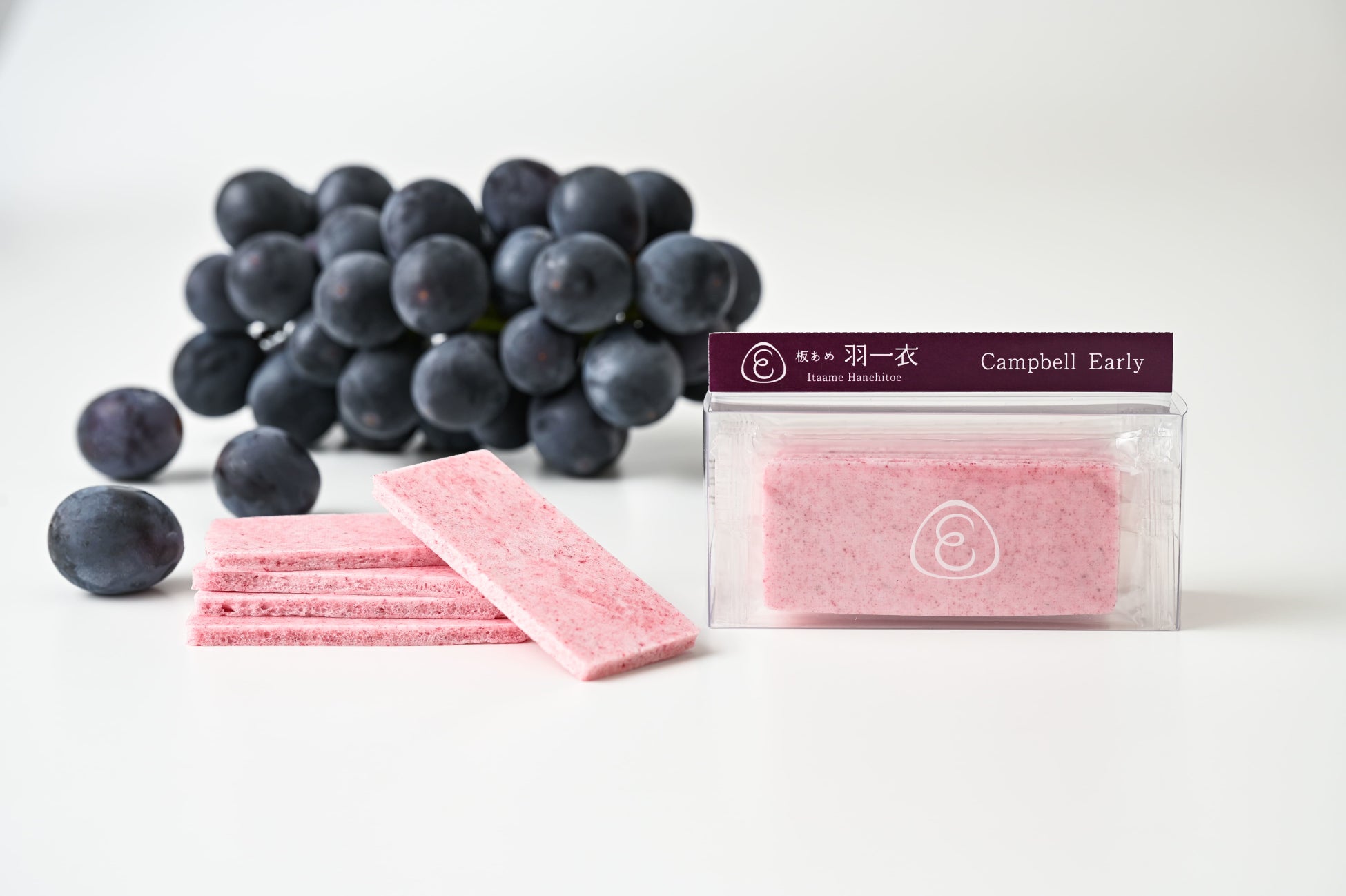 天女の衣のように薄く、綿菓子のように軽い、サクサクとした食感と口溶けが特徴の「板あめ 羽一衣」に、ぶどうの商品が仲間入りします。