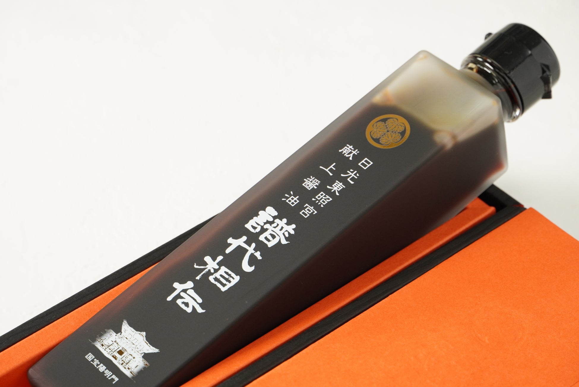 日光ろばたづけ製造本舗の日光東照宮献上醤油「譜代相伝」。半世紀の間造り続けた秘蔵の醤油。手間ひまかけた生醤油をさらに糀を仕込む独自の二段製法で、米糀由来の豊かな甘みは 他に類を見ないやさしい甘みが特徴です。