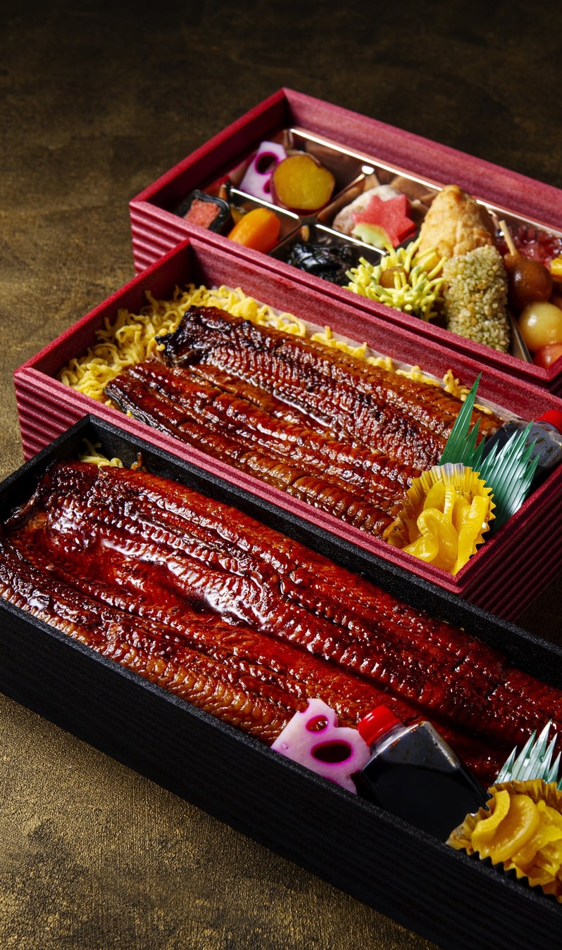 一段目には彩り豊かな四季折々の食材を詰め込み、二段目には柔らかくふっくらと仕上げたうな重を。