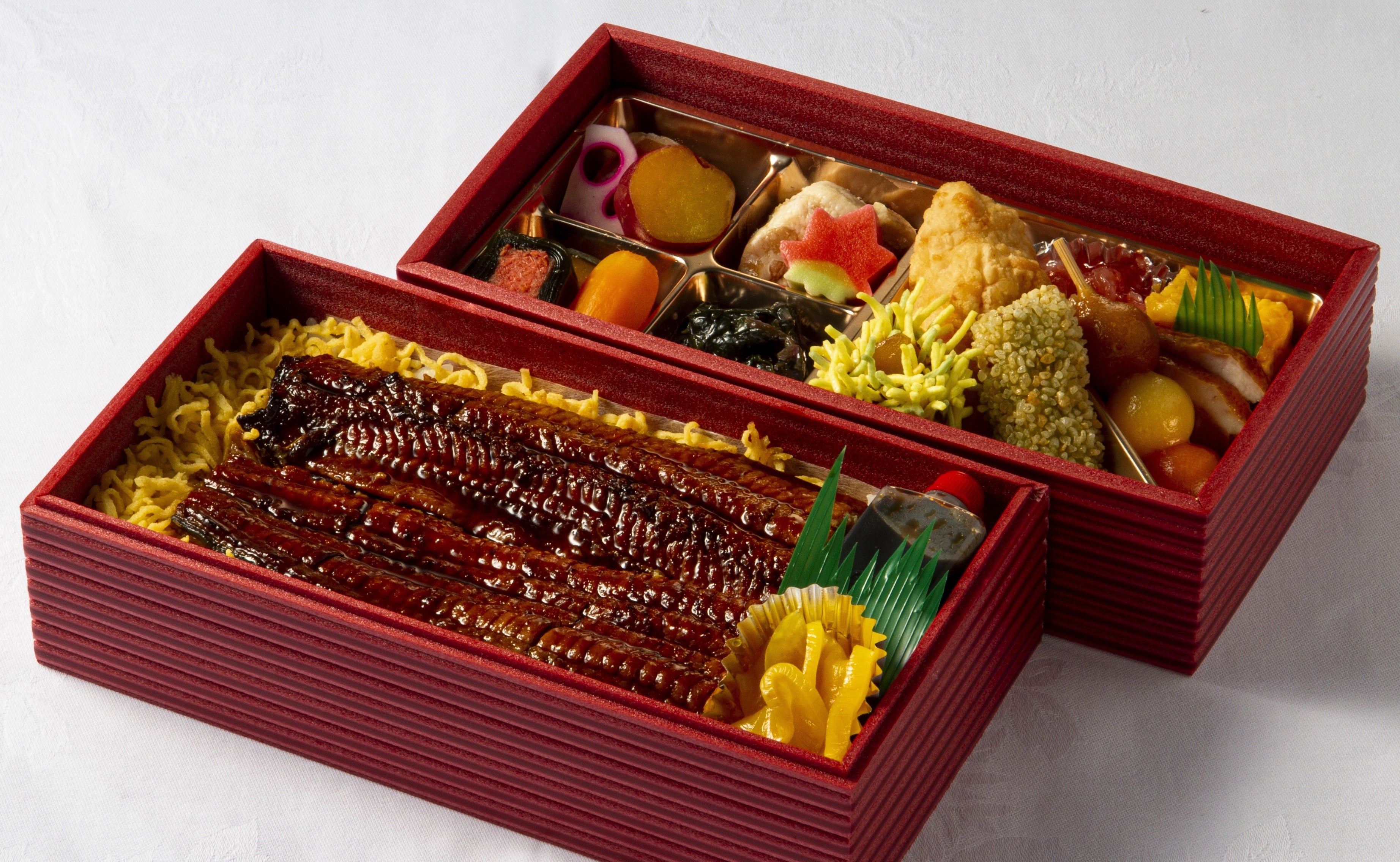 一段目には彩り豊かな四季折々の食材を詰め込み、二段目には柔らかくふっくらと仕上げたうな重を。