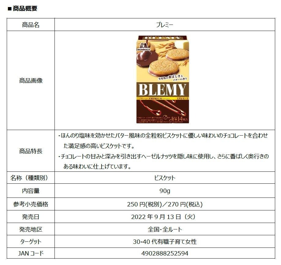 森永製菓株式会社(東京都港区芝、代表取締役社長・太田 栄二郎)は、森永ビスケットシリーズから、贅沢な味わいのビスケット「ブレミー」を9月13日(火)より全国にて発売いたします。3月から、首都圏・関東信越限定で販売しておりますが、大変ご好評いただき、この度全国に拡大して発売となりました。