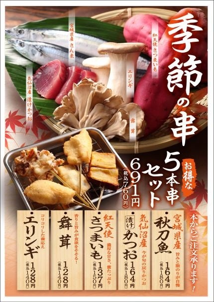 新メニュー「漬けかつお」に、秋限定の「秋刀魚」、「さつまいも」 「舞茸」に「エリンギ」を加えた5種の串をお得に味わえるセットです。