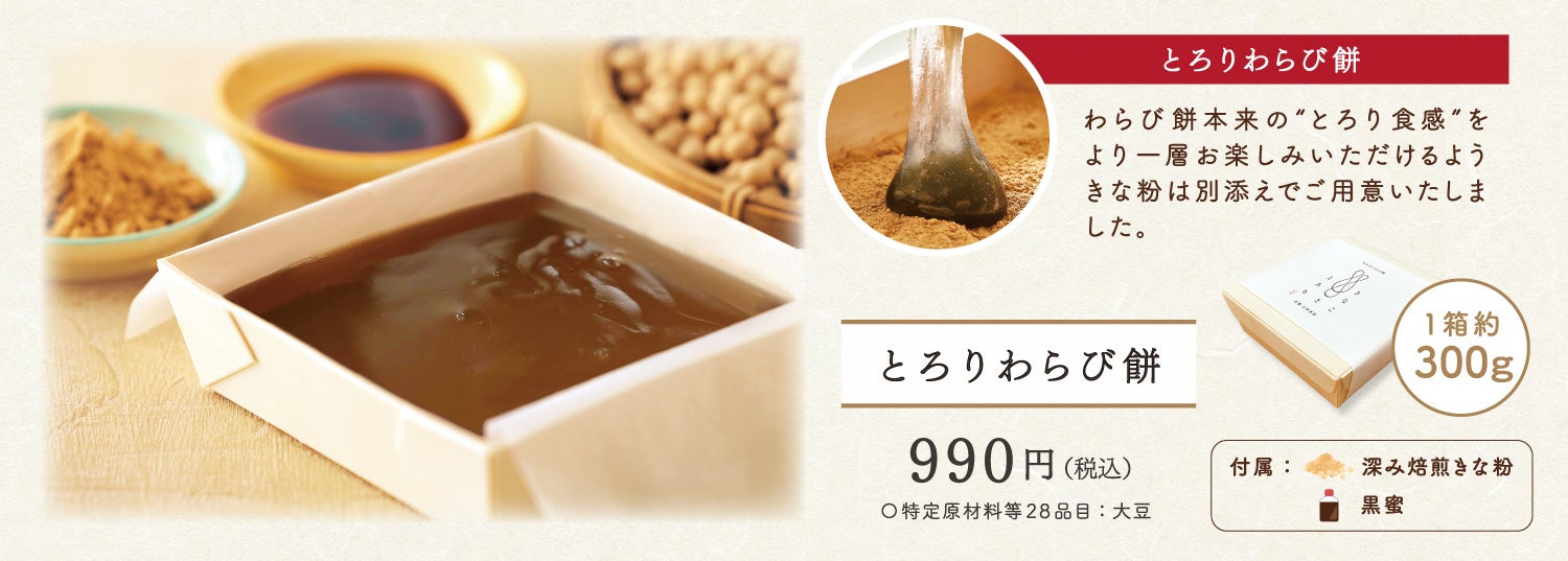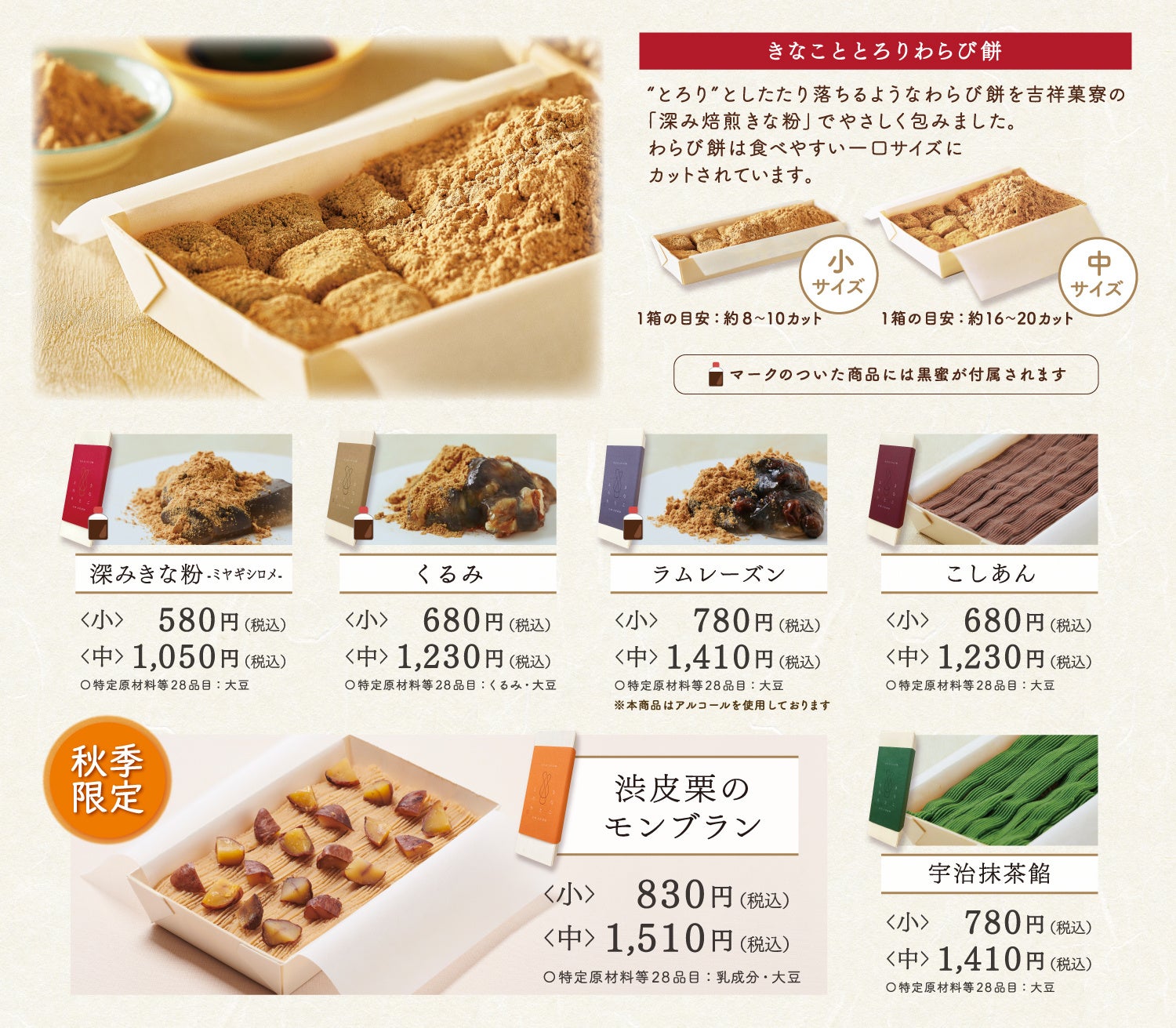京都生まれのわらび餅を、「きょうもあしたも、京のわらび。」と日常のおやつや、秋の手土産にぜひご利用ください。