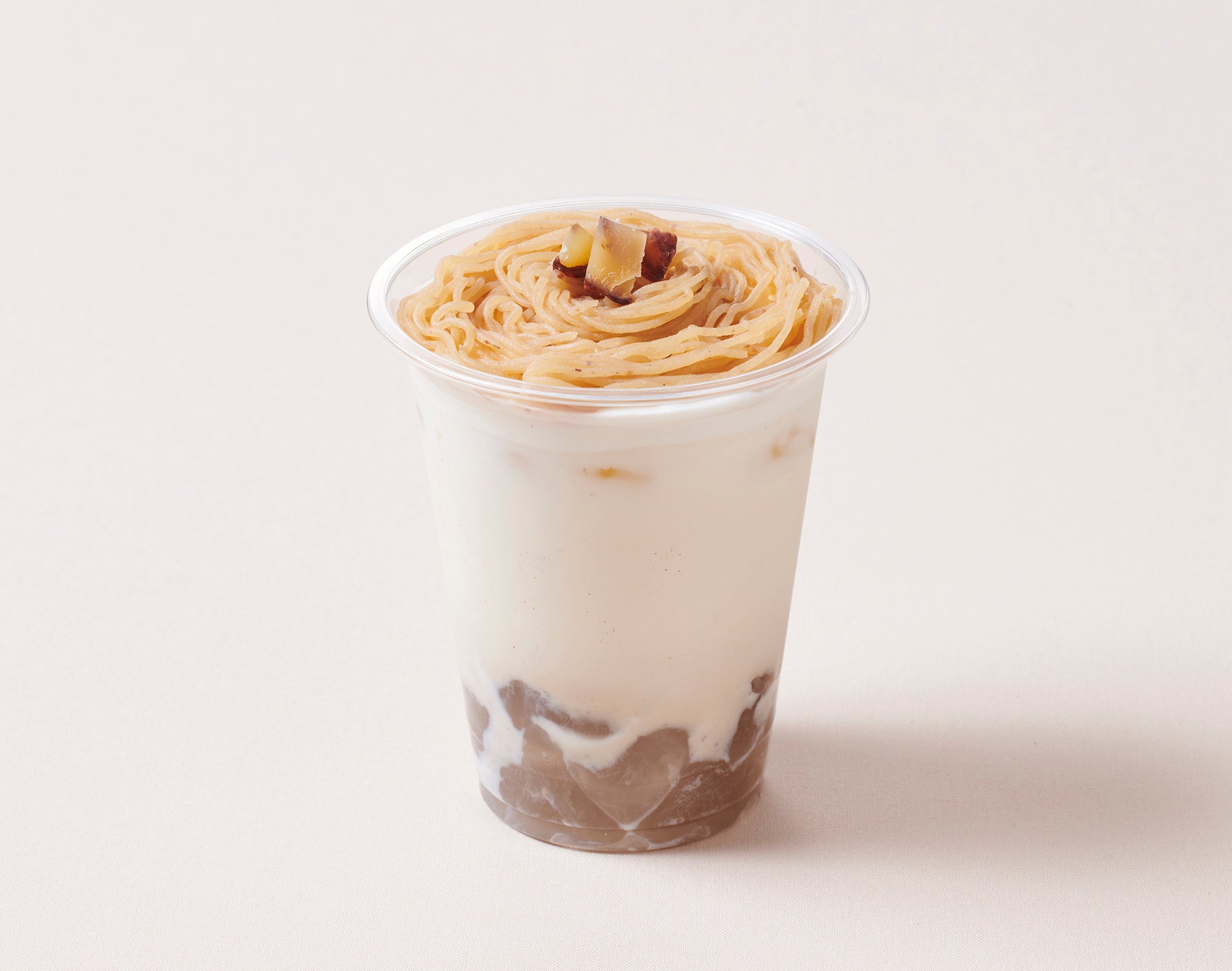 栗餡ミルクの上にさらにたっぷりと栗餡を絞り、渋皮栗をトッピングしました。モンブラン風に仕立てた栗餡ととろり食感のわらび餅。さらりとした飲み口のなかに優しい栗の甘味が広がります。