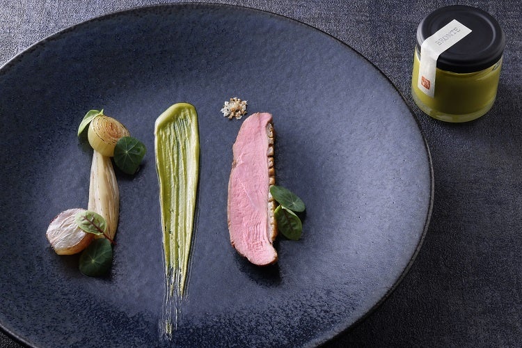 近江鴨のローストにたねやオリジナルのシチリア・ブロンテ産ピスタチオペーストを添えて。濃厚なピスタチオペーストと鴨のハーモニーをご堪能ください。
