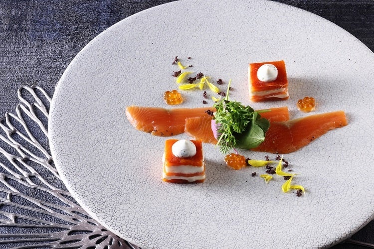 滋賀県産大鱒を自家製スモークに。たねやこだわりの市田柿とサワークリームで、甘さと爽やかな酸味と燻製のマリアージュをお楽しみください。
