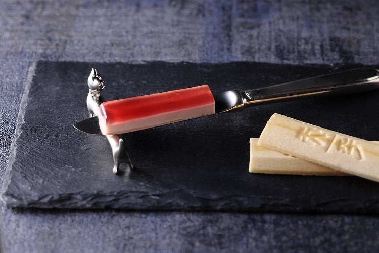たねやの代表銘菓「ふくみ天平」、最中種に伊吹ハムのムースとアドベリーのジュレを挟んで。パリパリの最中種とクリーミーなムースの食感をご体験ください。
