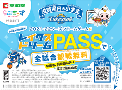 滋賀県内の小学生を2021-22シーズン滋賀レイクスのホームゲーム全30試合を対象に無料招待しました。滋賀県内に在住・在学している全小学生を対象に「平和堂らぶきっず presents レイクスドリームPASS」を発行し、ご提示いただくことで2階自由席の観戦チケットをお渡ししました。