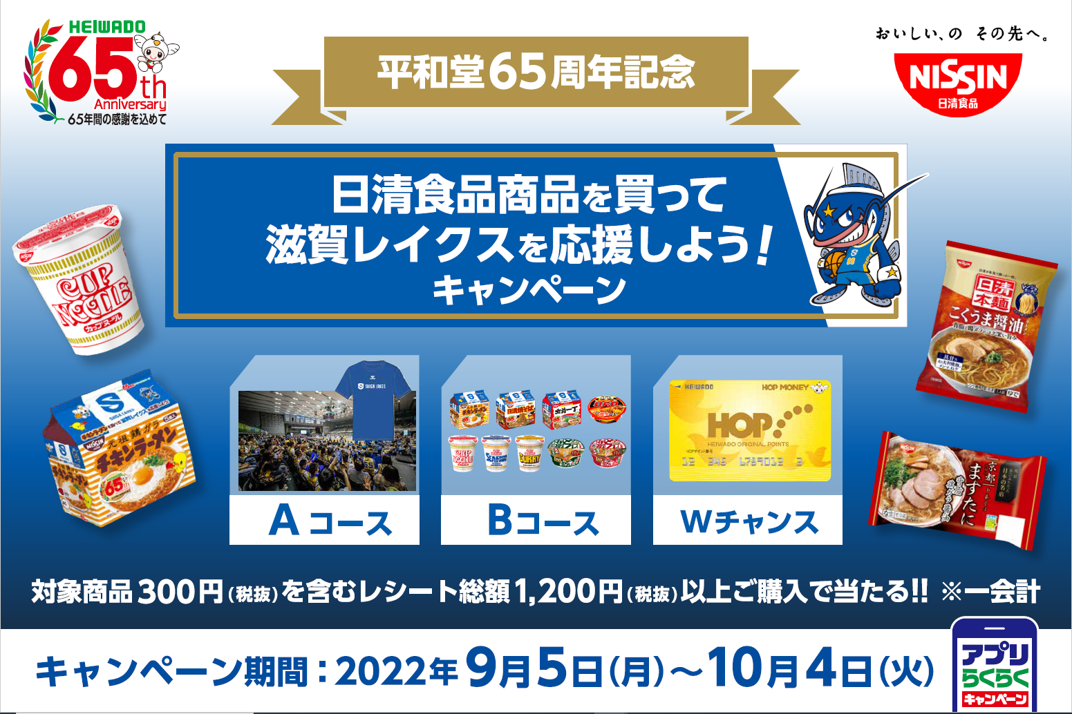 株式会社平和堂(滋賀県彦根市、代表取締役社長執行役員:平松正嗣)は、プロバスケットボールリーグ「B.LEAGUE」1部に所属する「滋賀レイクス」(運営:株式会社滋賀レイクスターズ)との取り組みとして、特別パッケージを施した日清食品株式会社の人気商品シリーズ商品3種を、2022年9月5日(月)より数量限定で平和堂・エール157店舗で販売します。また、日清食品の商品を買って滋賀レイクスを応援するキャンペーンを、同日より2022年10月4日(火)まで開催しますのでお知らせします。