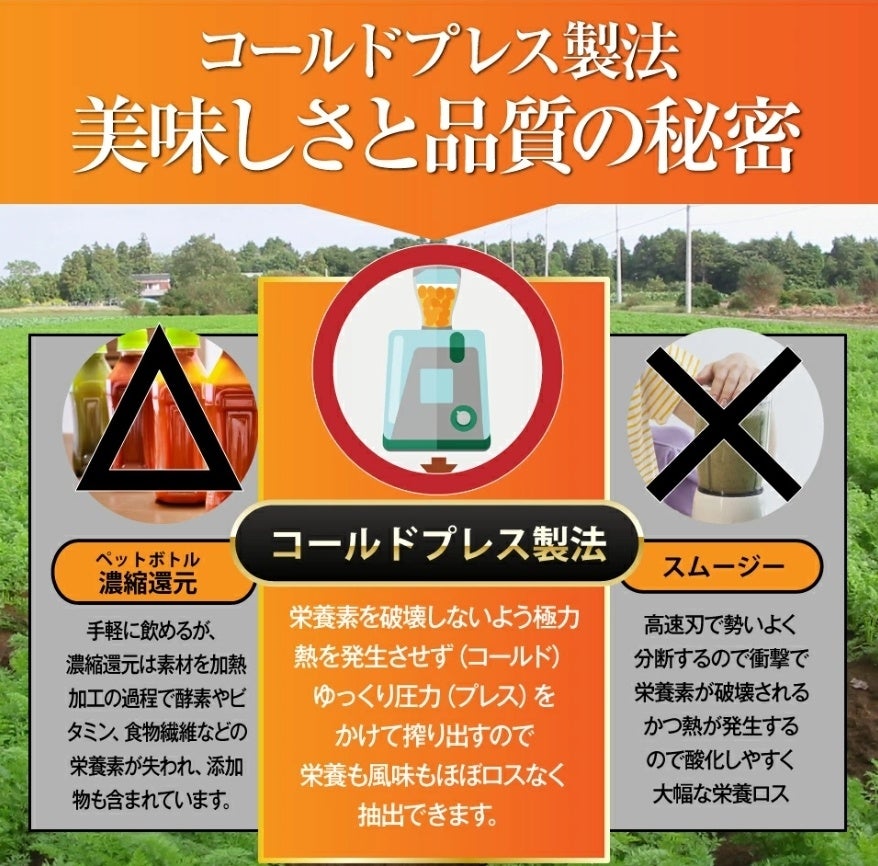 野菜や果物に衝撃や熱を極力加えず(コールド)ゆっくりとゆっくりと圧をかけて(プレス)搾り出していく製法。