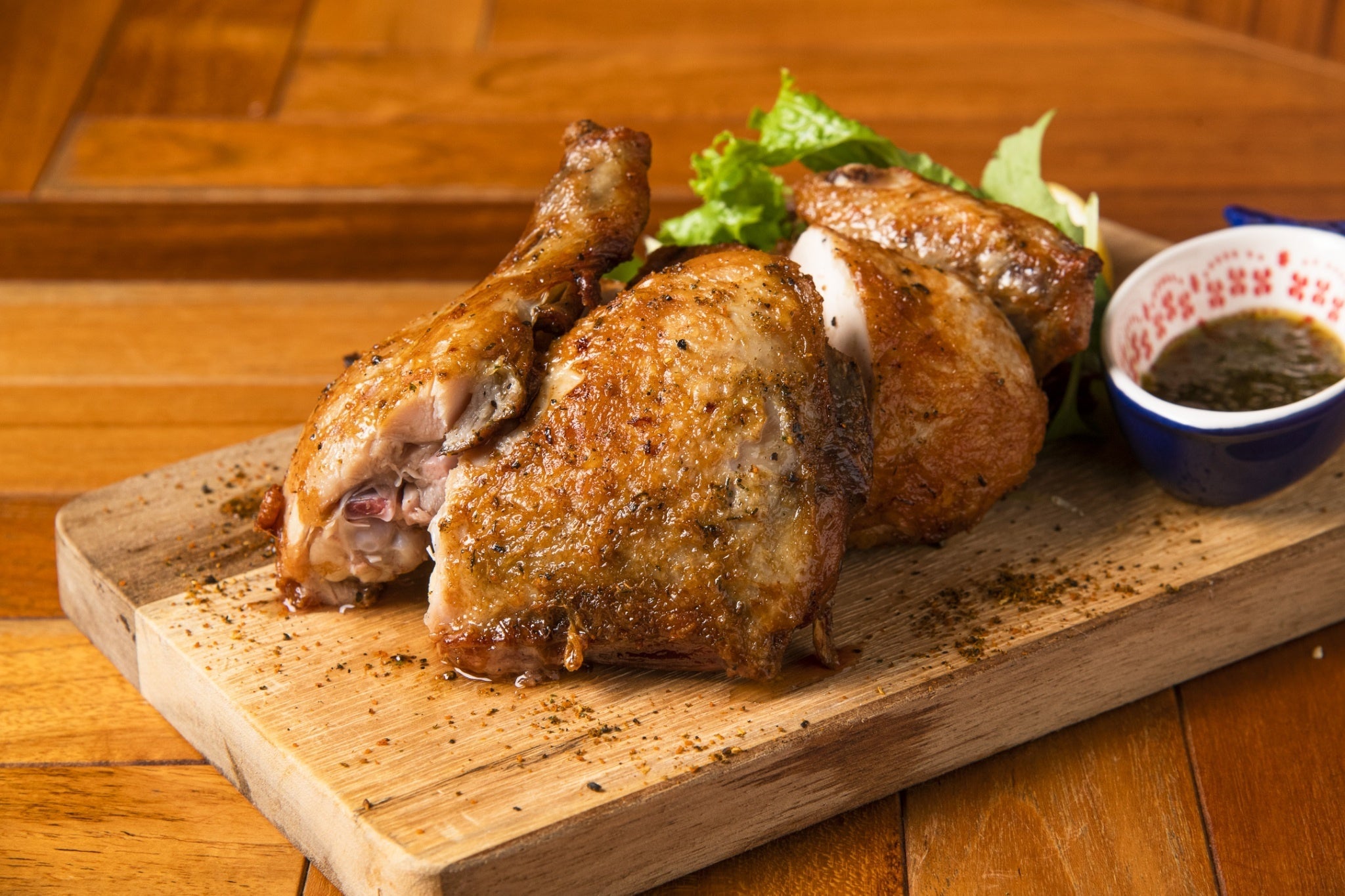 低温調理でしっとり仕上げた丸鶏に薪の香りとともに