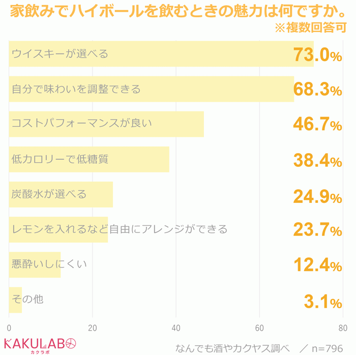 そこで、家飲みでハイボールを飲むときの魅力について深掘りしてみたところ、最も多かったのは「ウイスキーが選べる」で73%に上りました。