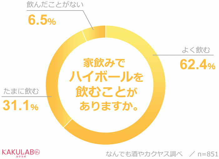 そんな多様性に富んだハイボールを家飲みで飲むことがあるかをカクヤスユーザーに聞いてみたところ、「よく飲む」62%、「たまに飲む」31%で、なんと9割以上が家飲みでハイボールを飲用していることがわかりました。
