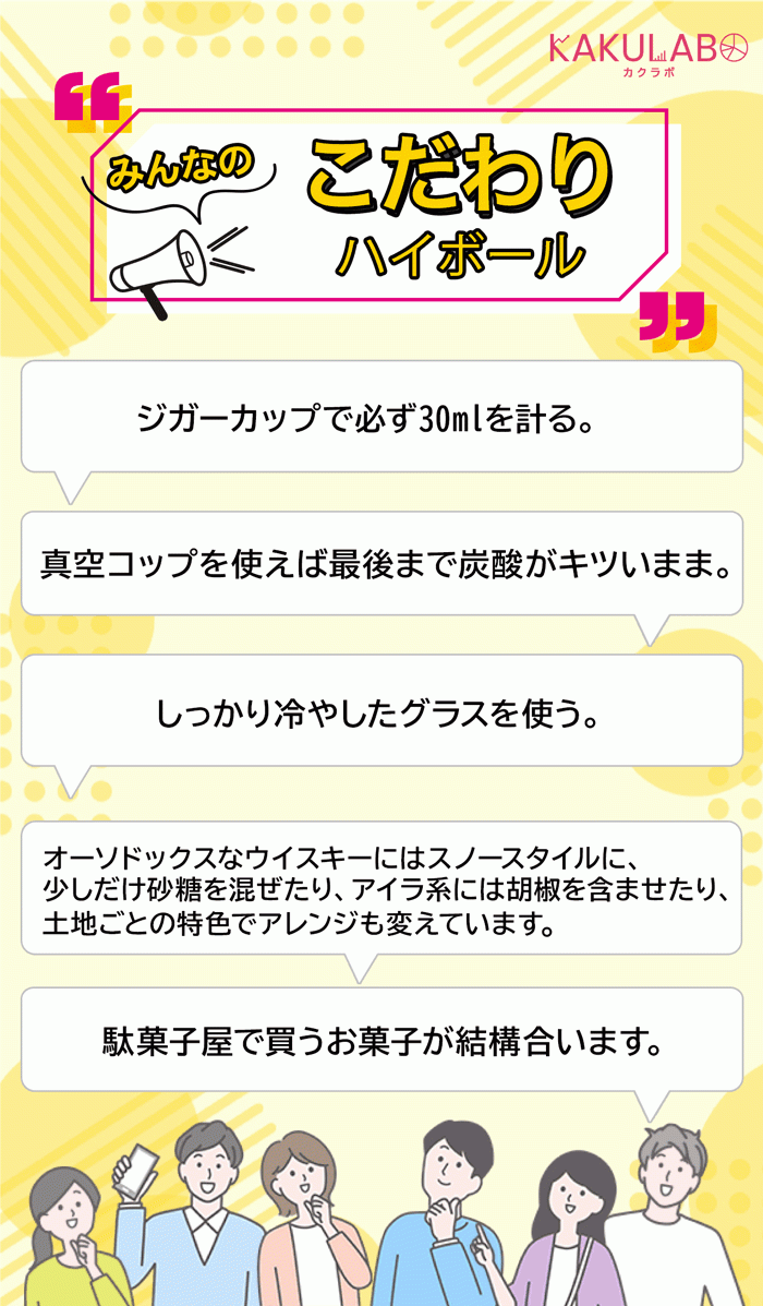 ウイスキーだけでなく、炭酸水についても「強炭酸を使う」「レモン味の炭酸水で割る」などこだわりがみられました。