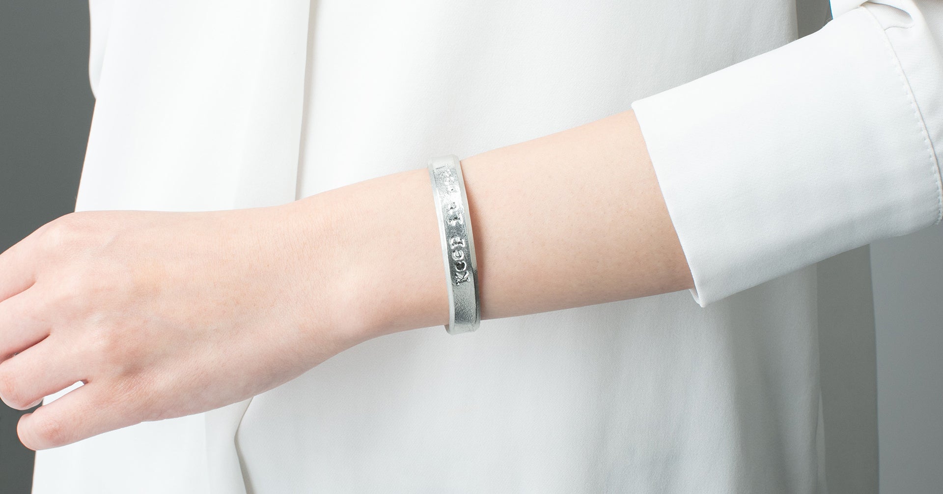 高岡での巡回展を記念した「高岡展コラボオリジナルグッズ」の一つとして、展覧会場限定の錫製バングルをデザイン・製作いたしました。錫100%製でやわらかく、手首にフィットさせて装着可能です。シンプルな形状と錫の落ち着いた輝きが手元を飾ります。THERE IS ALWAYS HOPEとKeep it realの2種類あります。ぜひ展覧会場でご覧ください。