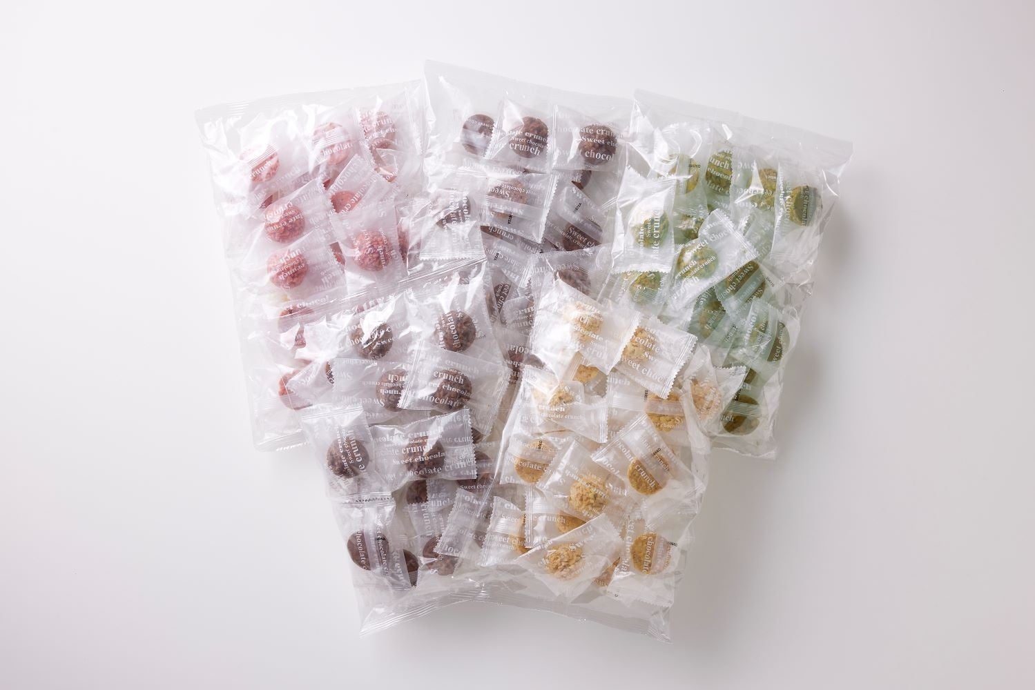 さっくりゴーフレットパフの食感がクセになる、人気の定番チョコレートクランチを ミルク・ホワイト・苺・抹茶の4種類からよりどり5袋をお好みでお選びいただけます。個包装されているので、お子様のおやつからイベントのノベルティ・女子会など大人数でシェアしたいときにもピッタリの商品です。