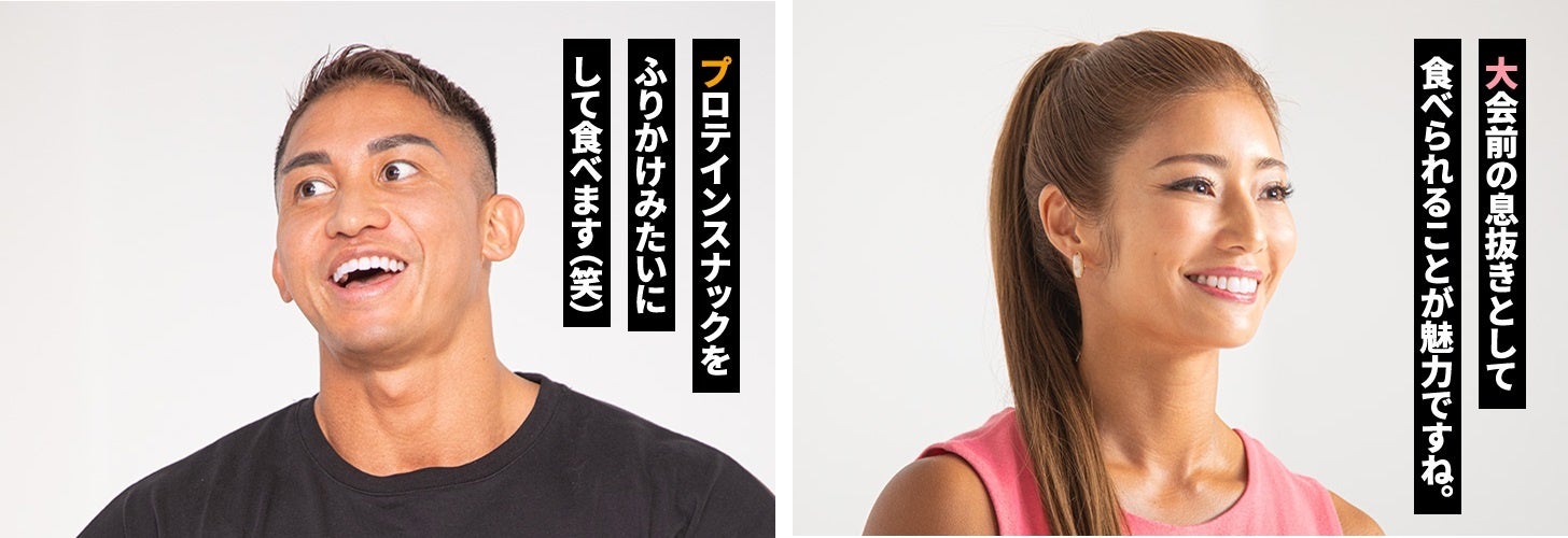 食事に気を使っているプロだけでなく、ボディメイクに本気で取り組んでいるトレーニーたちも普段から商品パッケージ裏面でしっかり見ているカロリーや食物繊維、鉄、亜鉛など、気になる栄養成分が商品パッケージ表面でも一目でわかるようにパッケージをリニューアル。さらに、プロ目線から見た『BODY STAR プロテインスナック』の魅力をJINさん、田上舞子さんに語っていただきました。