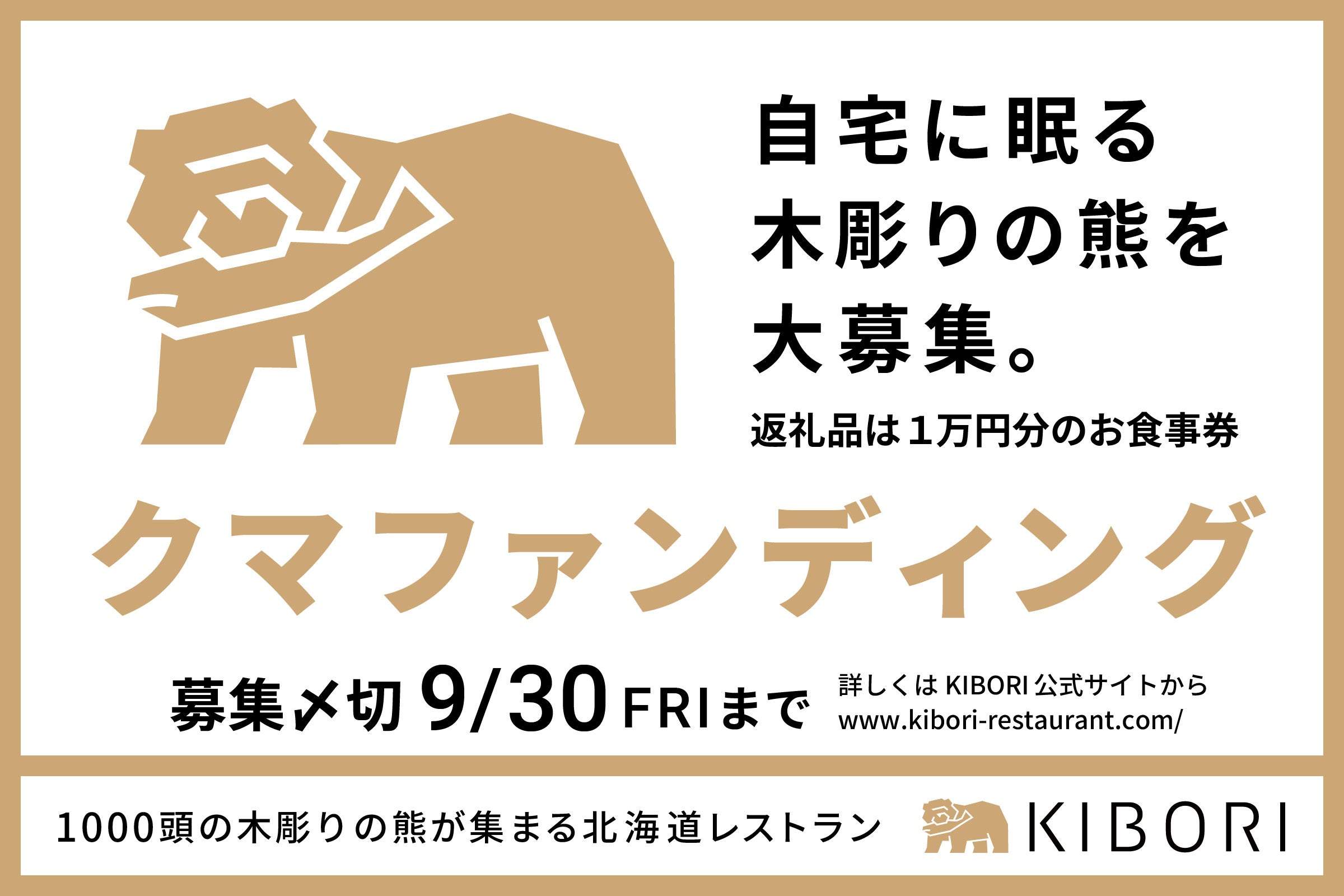 さらに、ロゴや店名の由来にもなっている「木彫りの熊」ですが、大小あわせて1000頭の木彫りの熊が店内に並ぶ予定です。その一部について、広く一般から募集する「クマファンディング(略してクマファン)」を実施いたします。ご自宅に眠る「木彫りの熊」をお送りいただき、リメイクして店内装飾として再活用させていただきます。採用された方には、 返礼品としてKIBORIオープン後に使える「1万円分のお食事券」を贈呈させていただきます。