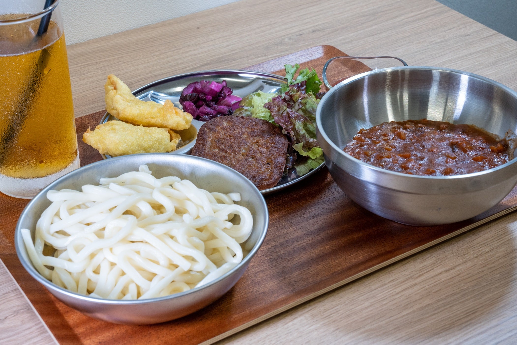 懐かしのハンバーグがメインとなる給食スタイルの定食。ソフト麺はミートソースと鶏天、ご飯は筑前煮とみそ汁がセットになります。