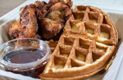 平成に行列ができるほど大流行したワッフルが背徳メニューとしてリバイバル。ふわふわワッフルとしっとりチキンのコンビ。メープル味のシロップ付きで甘じょっぱい新感覚のワッフルです。