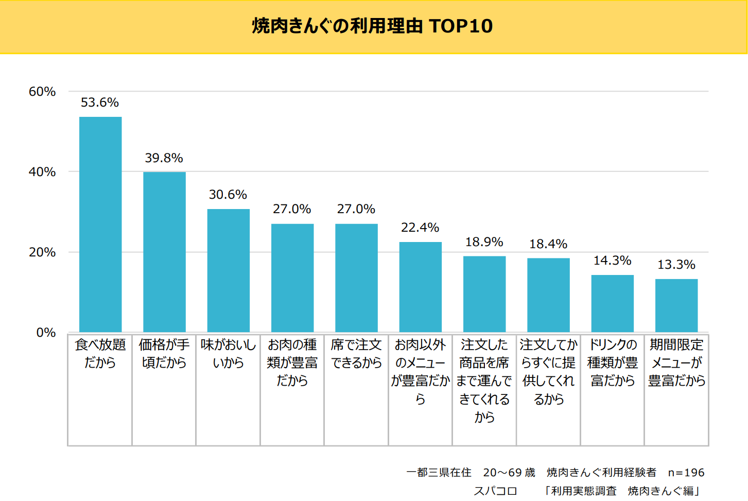 焼肉きんぐの利用理由では、上位から「食べ放題だから」(53.6%)、「価格が手頃だから」(39.8%)、「味がおいしいから」(30.6%)、「お肉の種類が豊富だから」「席で注文できるから」(各27.0%)が続いています。結果からは、食べ放題という業態の性質上コストパフォーマンスを重視し利用されていることが伺えます。