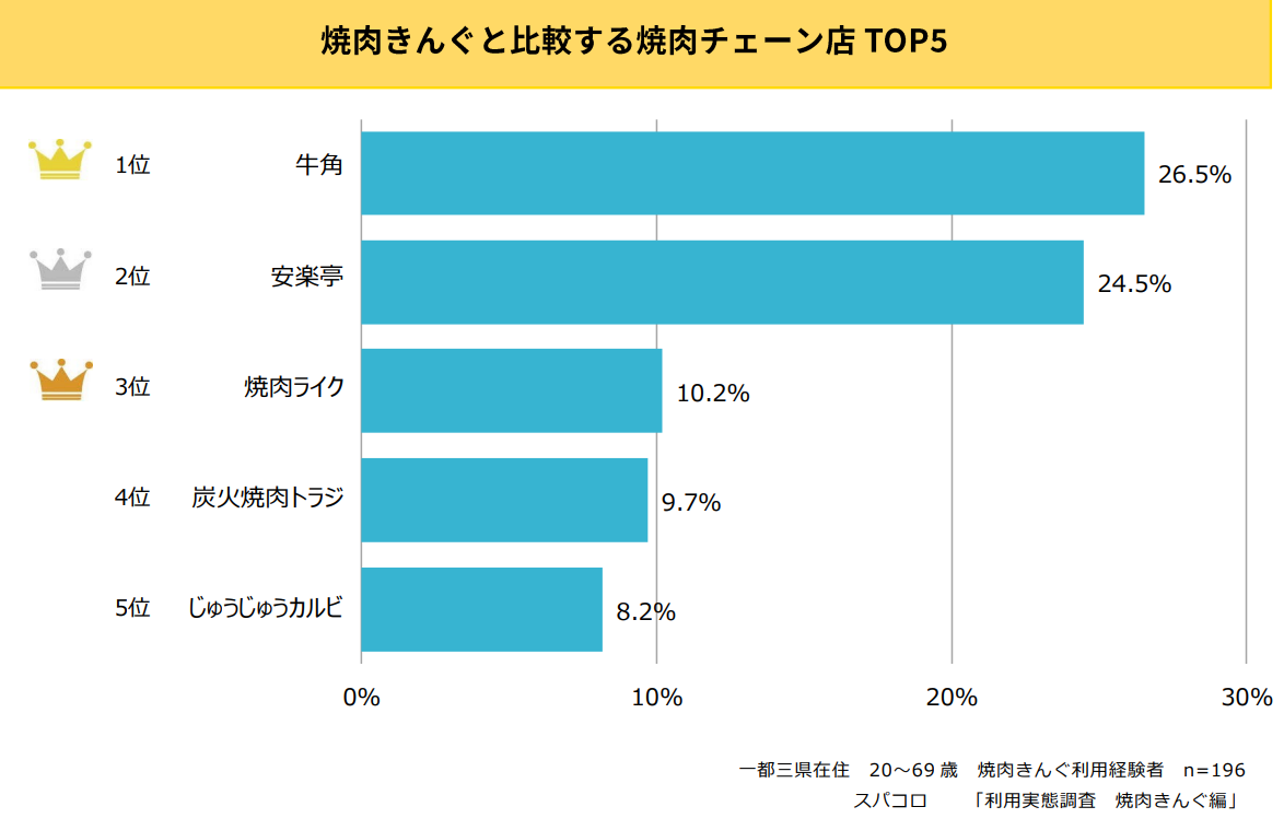 『焼肉きんぐを利用する時に、焼肉きんぐと比較して利用するか迷う焼肉チェーン店はありますか』という質問について最も高いのは、「牛角」(26.5%)でした。次いで「安楽亭」(24.5%)、「焼肉ライク」(10.2%)、「炭火焼肉トラジ」(9.7%)が続いています。