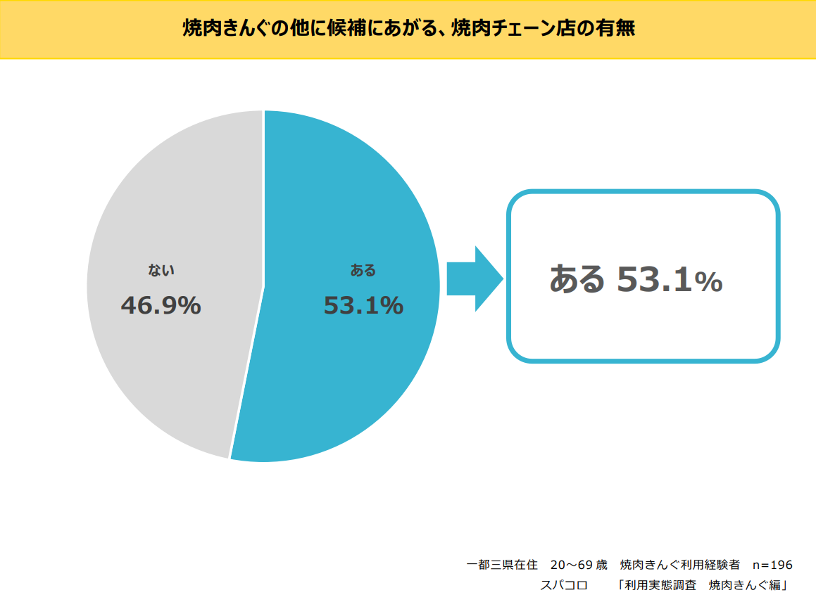 『焼肉きんぐを利用する時に、焼肉きんぐと比較して利用するか迷う焼肉チェーン店はありますか』という質問に対して、「ある」と回答した人は、 焼肉きんぐの購入経験者のうち53.1%。これに対し「ない」と回答した人の割合は46.9%という結果に。