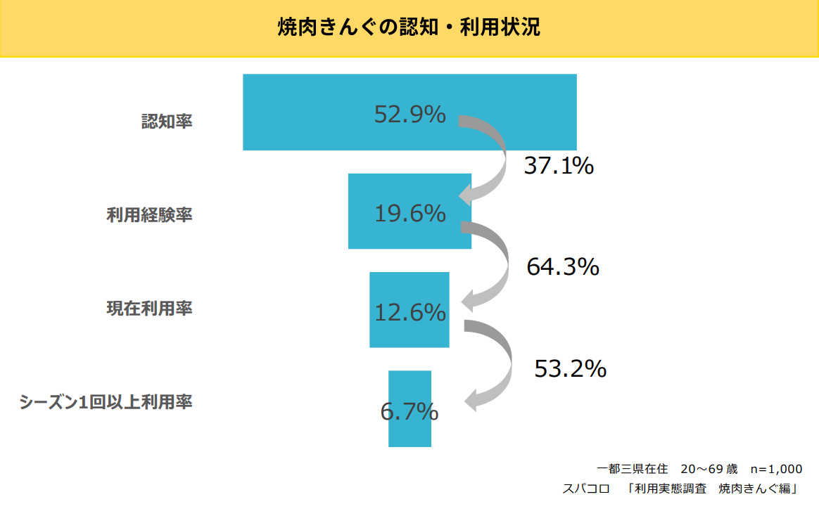一都三県在住の20~69歳の1,000人に聞いた焼肉きんぐの浸透状況についてみてみると、認知率52.9%、利用経験率19.6%、現在利用率12.6%、シーズン1回以上利用率6.7%という結果に。