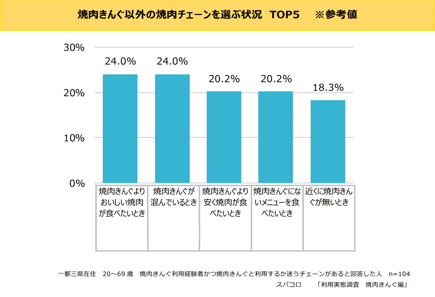 焼肉きんぐ利用経験者にきいた焼肉きんぐ以外を選ぶ理由では上位から、「焼肉きんぐよりおいしい焼肉が食べたいとき」(24.0%)、「焼肉きんぐが混んでいるとき」(24.0%)、「焼肉きんぐより安い焼肉が食べたいとき」(20.2%)、「焼肉きんぐにないメニューを食べたいとき」(20.2%)が続いています。結果からは置かれている状況で求める味や価格などを要因に他店へ選んでいることが伺えます。