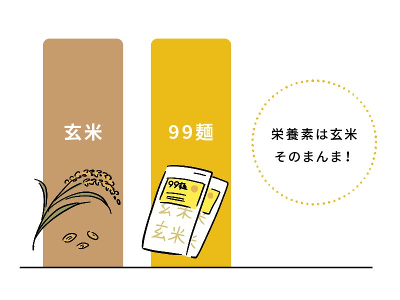 玄米は、白米よりも、ビタミン・ミネラル・食物繊維を豊富に含んでおり完全栄養食と言われています。99麺あきたこまち玄米麺は、非加熱の製粉技術で、玄米に豊富に含まれる食物繊維や、不足しがちなミネラル類、生きるエネルギーに欠かせないビタミンB 群や葉酸、カラダをつくるアミノ酸など、今まで加工熱で壊れやすいとされてきた栄養素がきちんと残った状態での商品化に成功しました。玄米そのままの「完全栄養麺」です。