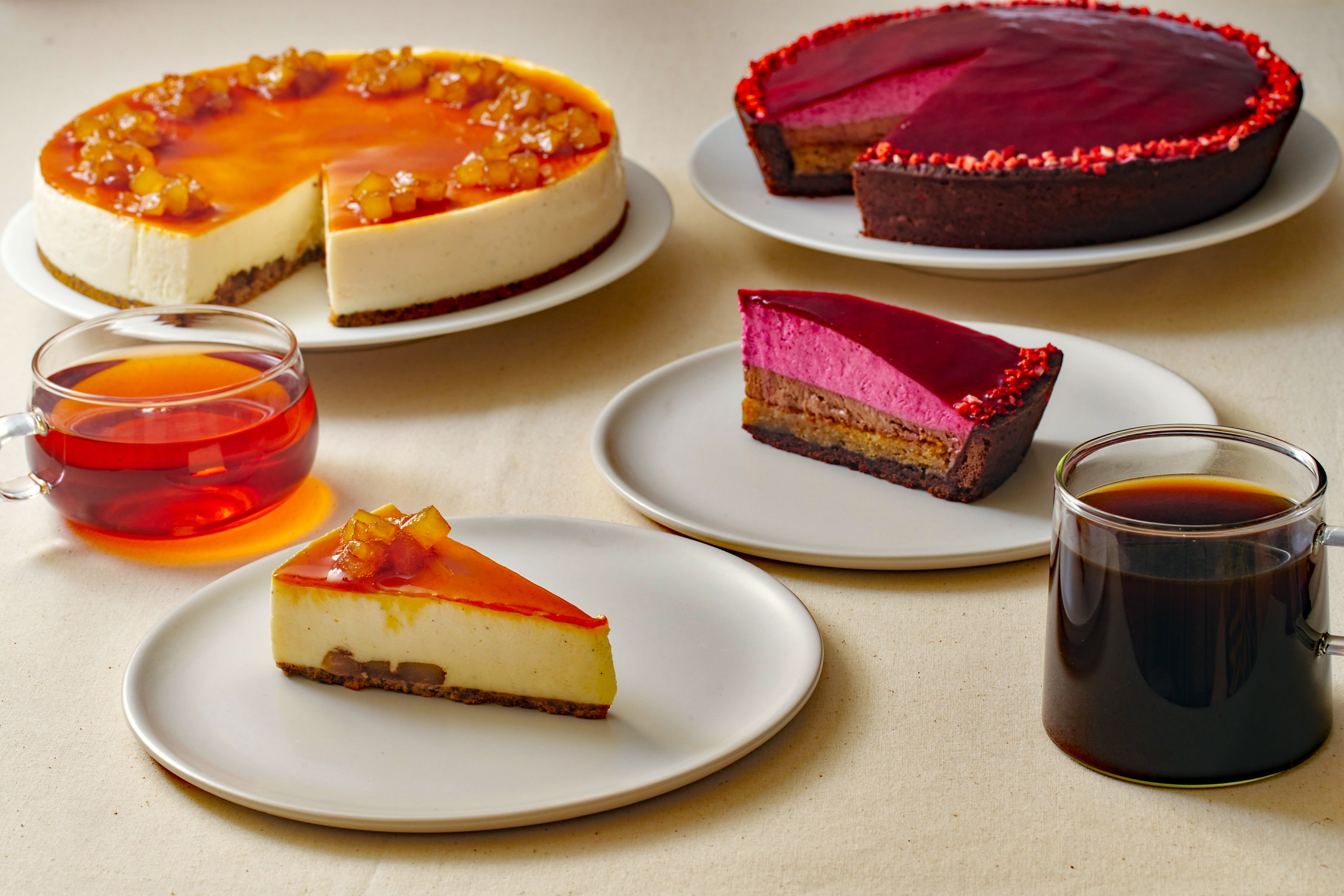 「アップルチーズカラメル」=写真左=は、なめらかで口どけのよいチーズムースに、カラメルテイストに味付けした国産リンゴの食感がほどよいアクセントのケーキです。「カカオ&カシス」=同右=は、カシスの酸味、ビターなカカオ&ココアの香りと甘みが調和したタルトケーキです。