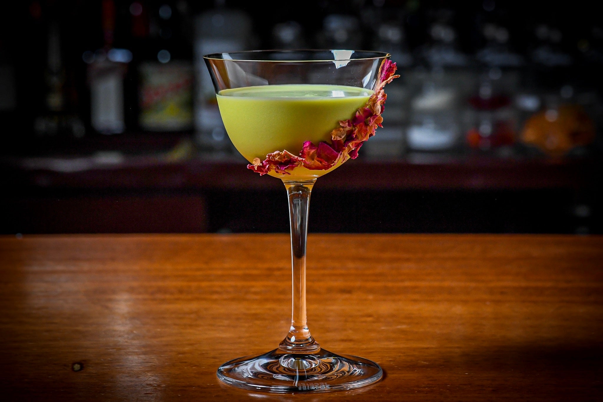 オリジナルのローズスピリッツとピスタチオをベースにホワイトチョコレートを加えた濃厚なデザートカクテル。グリーンでフローラルなローズスピリッツとピスタチオの香ばしさが調和する中に、ホワイトチョコレートの濃厚さを加えました。今までにありそうで無かった組み合わせです。また、グラスの外側にドライローズをあしらい、グラスを鼻に近づけるとローズのフローラルな香りが漂います。1,870円(税込)/杯。