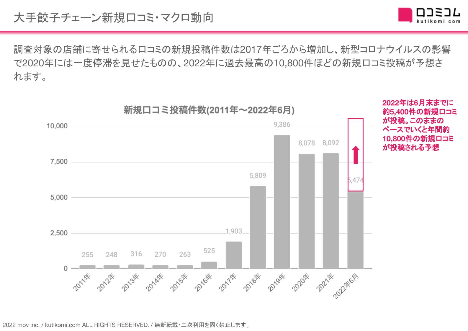 調査対象の店舗に寄せられる口コミの新規投稿件数は2017年ごろから増加し、新型コロナウイルスの影響で2020年には一度停滞を見せたものの、2022年に過去最高の10,800件ほどの新規口コミ投稿が予想されます。