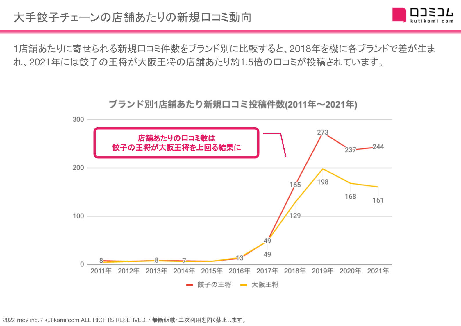 1店舗あたりに寄せられる新規口コミ件数をブランド別に比較すると、2018年を機に各ブランドで差が生まれ、2021年には餃子の王将が大阪王将の店舗あたり約1.5倍の口コミが投稿されています。