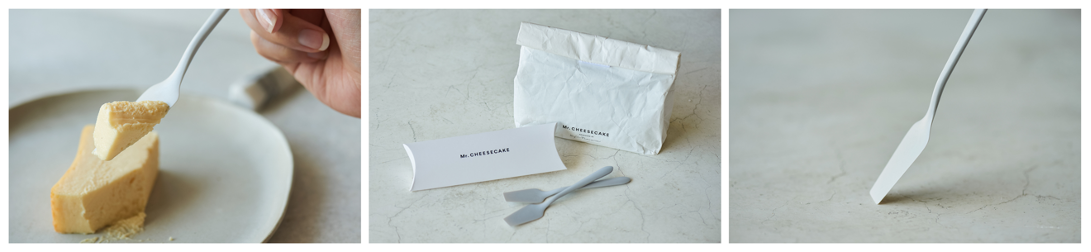 オリジナルスプーン2本と通常フレーバー「Mr. CHEESECAKE with Cooler Bag」がセットになった商品。わずか0.3mmの先端のうすさと、ヘラのような平らなデザインのスプーンは、味わいに摩擦を生みにくくケーキ本来の味わいを深く感じられます。