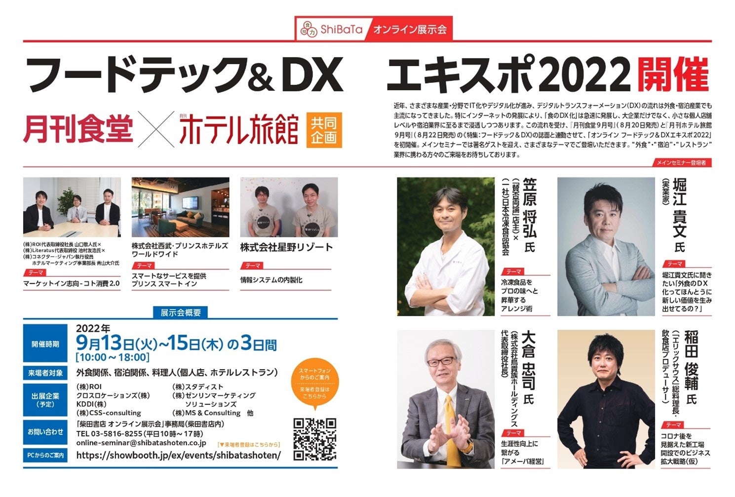 「食のDX化」をテーマに『月刊食堂9月号』と『月刊ホテル旅館9月号』の《特集:フードテック&DX》の誌面と連動させて、「オンラインフードテック&DXエキスポ2022」が開催されます。メインセミナーには著名ゲストが登壇予定。