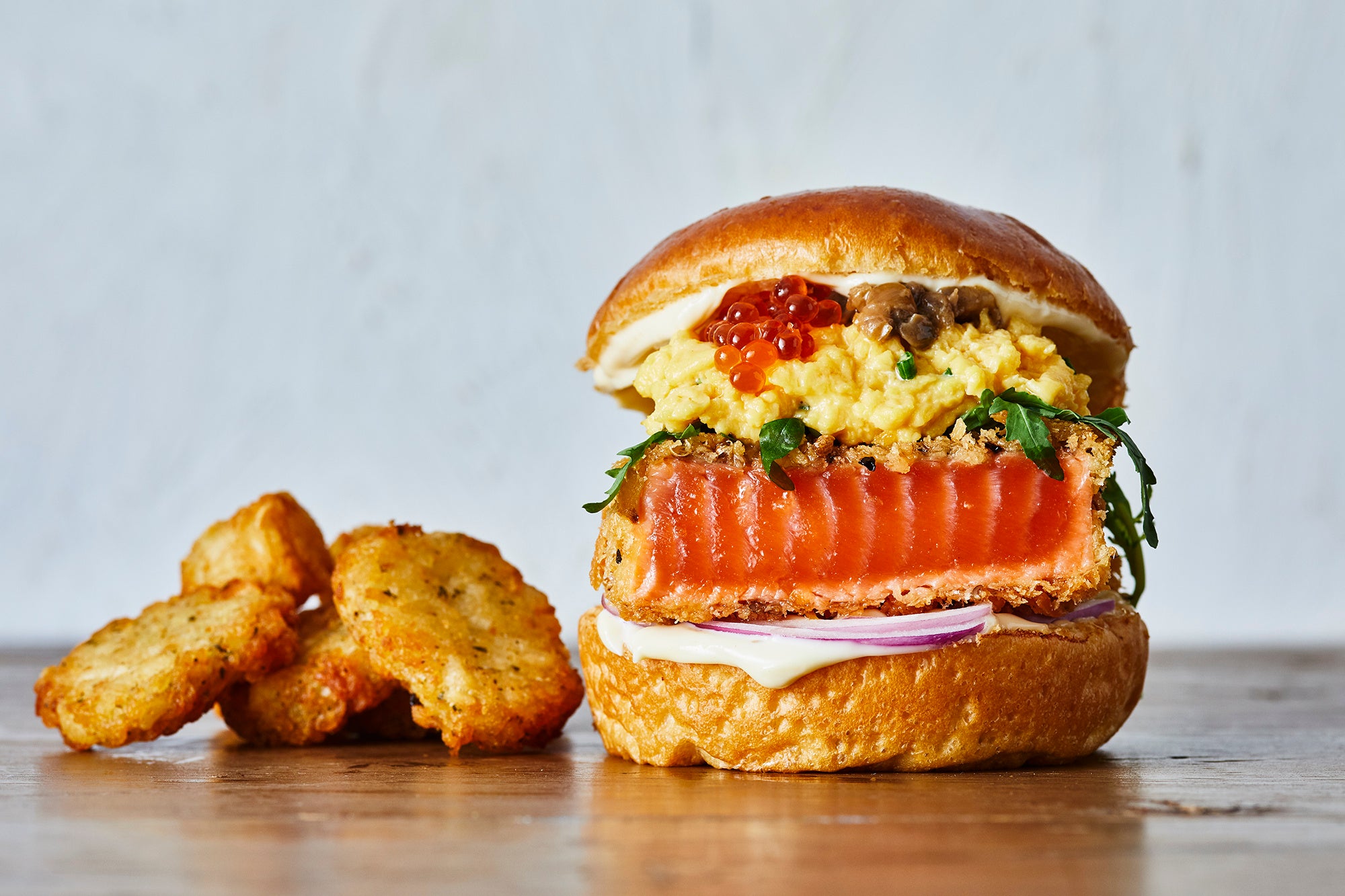 レアに火入れしたサーモンの断面が美しい「レアサーモンカツ&ポルチーニエッグサンド」は、数量限定のプレミアムなエッグサンド。鮮度にこだわり半身の状態で仕入れるサーモンの身厚の部分だけを切り出し、スパイスの香る衣でサッと揚げたとろけるレアサーモンカツに合わせるのは、eggslut自慢のスクランブルエッグ。発酵バターの香るクリーミーな卵に、ディジョンマスタードとマヨネーズのソースや香味野菜が合わされば、まるで濃厚なタルタルソースのような味わいに変化します。